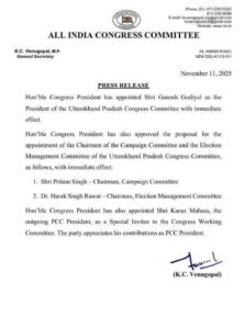 – प्रीतम सिंह और हरक सिंह रावत को भी महत्वपूर्ण जिम्मेदारी
