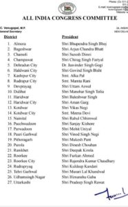 देहरादून। मंगलवार की देर शाम कांग्रेस पार्टी के केंद्रीय नेतृत्व ने लम्बे समय से प्रतीक्षित उत्तराखंड कांग्रेस, जिला और शहर कांग्रेस के अध्यक्षों की सूची जारी कर दी है।