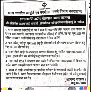 देहरादून। भारत सरकार के निर्देशों के क्रम में *प्रधानमंत्री ग़रीब कल्याण अन्न योजना* के राशन कार्ड धारकों (अन्त्योदय एवं प्राथमिक परिवारों ) को अप्रैल-मई-जून माह का अग्रिम खाद्यान वितरण इसी महीने अर्थात् अप्रैल माह में किया जाएगा। यह जानकारी खाद्य आयुक्त आनंद स्वरूप की ओर से दी गई।