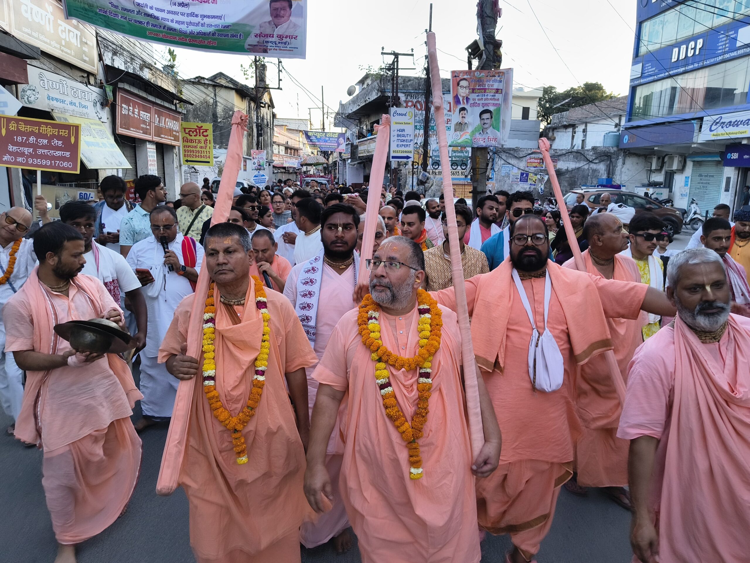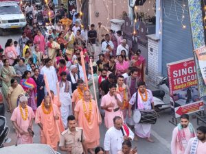 डीएल रोड स्थित मठ के रक्षक त्यागी महाराज की अध्यक्षता में रविवार की शाम नगर संकीर्तन प्रारंभ हुआ। अखिल भारतीय श्री चैतन्य गौड़ीय मठ के आचार्य स्वामी भक्ति विचार विष्णु महाराज ने महामंत्र का जाप किया। निरीह महाराज ने राधे-राधे धुन पर संकीर्तन किया। त्रिदंडी महाराज के भजनों पर श्रद्धालु नृत्य करते हुए झूम उठे।