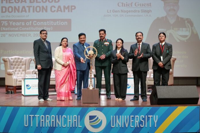 देहरादून। उत्तरांचल विश्वविद्यालय के लॉ कॉलेज देहरादून में आज संविधान दिवस 2025 को श्रद्धा, सम्मान, संकल्प व त्याग के साथ मनाया गया। आईएमए के कमांडेंट लेफ्टिनेंट जनरल नागेन्द्र सिंह इस अवसर पर बतौर मुख्य अतिथि उपस्थित रहे।